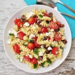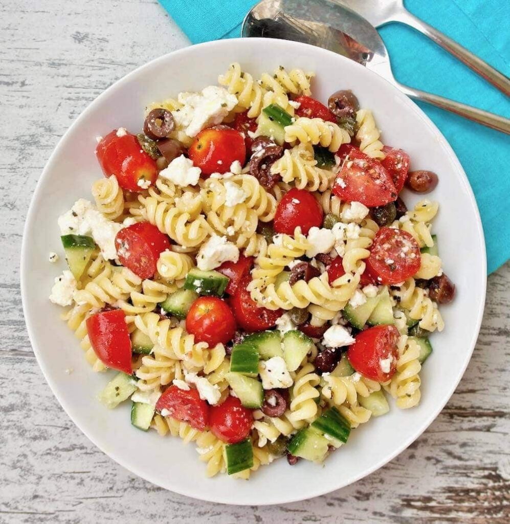 This salad provides carbohydrates and healthy fats and is naturally vegetarian. It can be adapted for gluten-free diets by using gluten-free pasta.