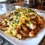 Breakfast Poutine with Hollandaise Sauce takes the classic comfort of traditional poutine and transforms it into a luxurious, satisfying morning meal. Golden breakfast potatoes, crisp bacon or sausage, soft cheese curds, and perfectly cooked eggs come together under a silky blanket of warm hollandaise. It’s an indulgent, restaurant-worthy dish that feels just as perfect for weekend brunch as it does for a cozy breakfast-for-dinner night. I once swapped the cheese curds for small cubes of smoked mozzarella, and the gentle smoky flavor paired beautifully with the hollandaise—unexpected but delicious. This recipe strikes a balance between hearty and elegant, combining layers of textures and flavors that feel both comforting and elevated. It’s customizable, impressive, and surprisingly simple to prepare once you have your ingredients ready. Whether shared with guests or enjoyed with a cup of coffee on a slow morning, this breakfast poutine is a memorable, crowd-pleasing twist on a classic.