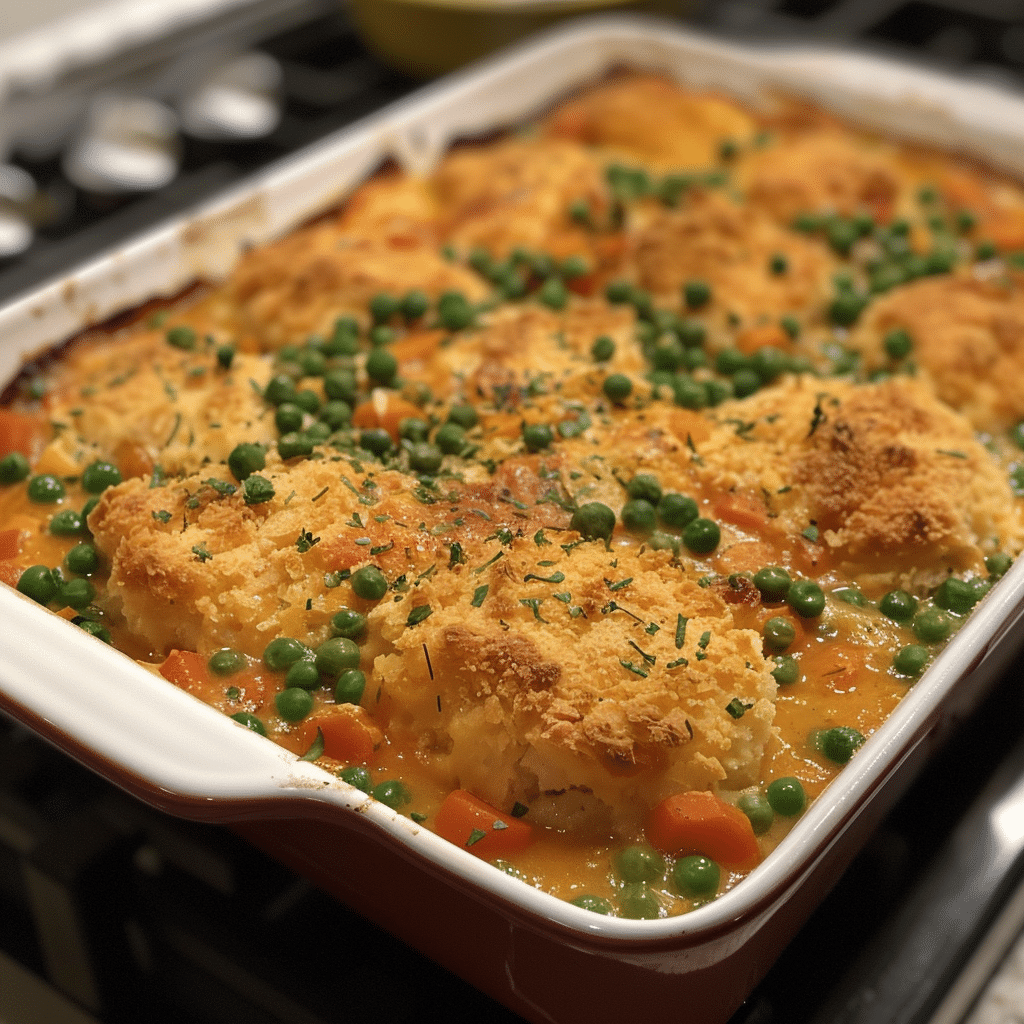 A hearty, savory cobbler-style casserole featuring tender chicken and vegetables in a creamy sauce, topped with a buttery Cheddar Bay biscuit crust — a comforting twist on a Southern favorite.