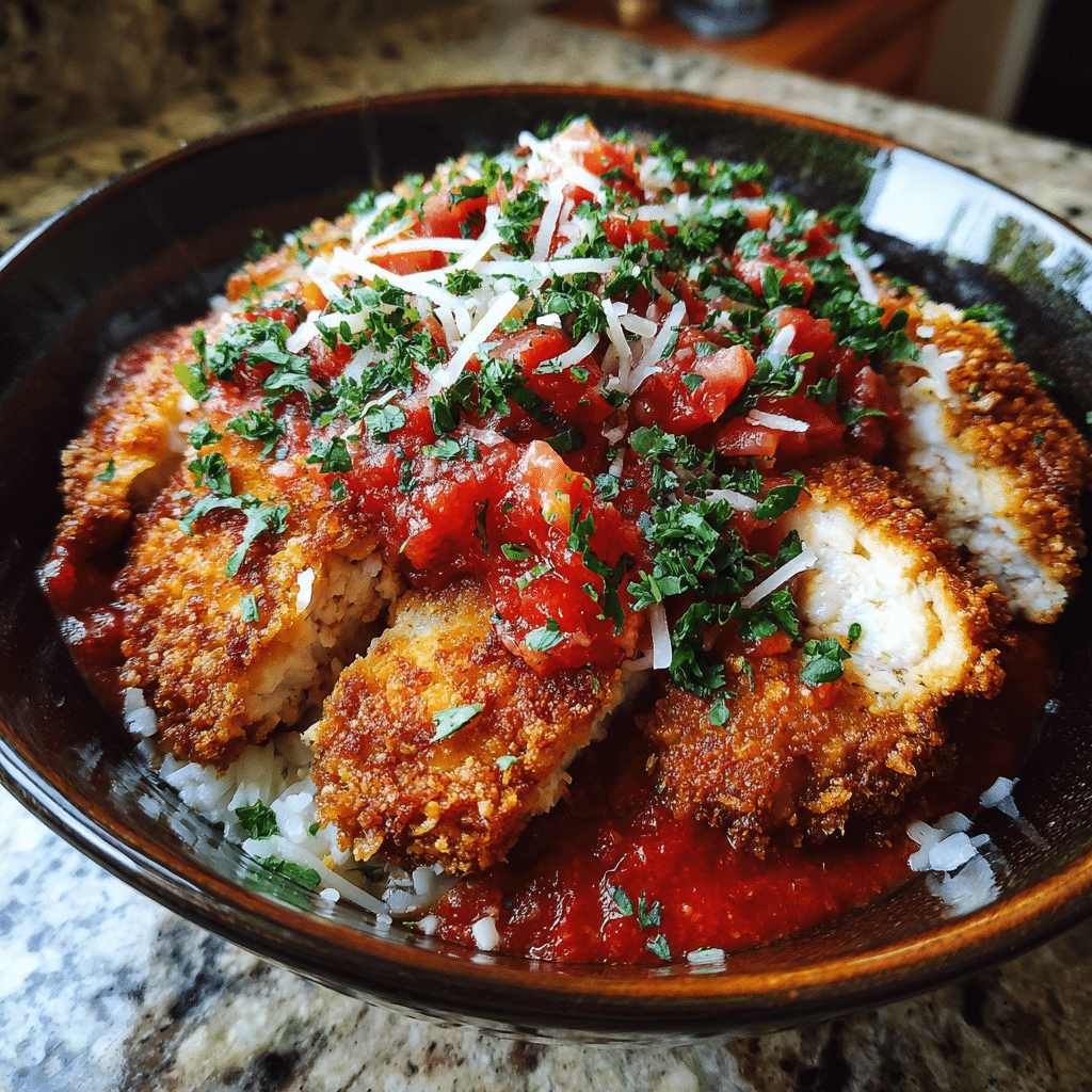 For extra spice, add crushed red pepper flakes to the marinara or breadcrumb mixture. You can also swap chicken for breaded eggplant or tofu to create a vegetarian-friendly bowl without sacrificing flavor.