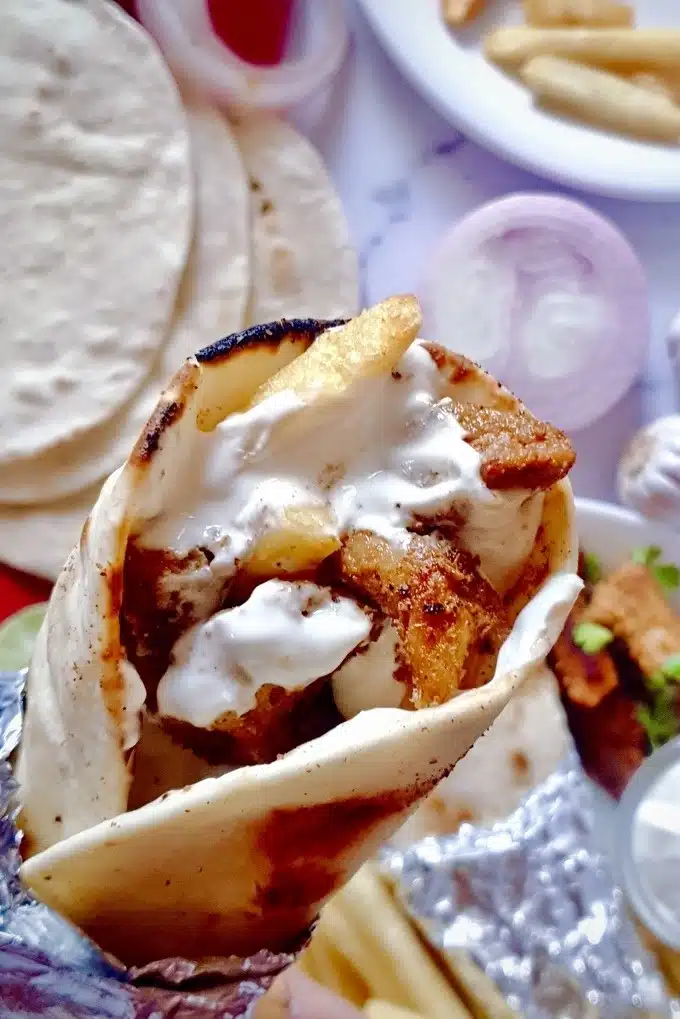 To prepare the garlic sauce, combine Greek yogurt, mayonnaise, minced garlic, vinegar or lemon juice, and salt in a bowl. Whisk until smooth and creamy. Adjust seasoning to taste.