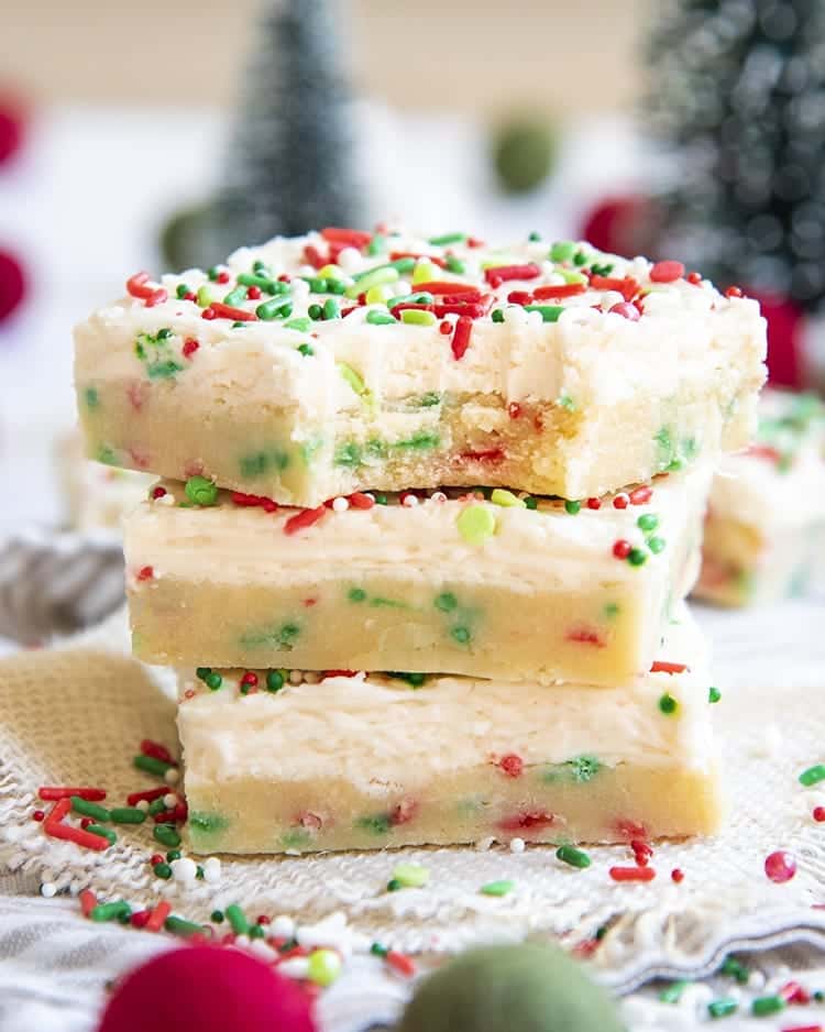Store Christmas Cookie Bars in an airtight container at room temperature for up to five days. They can also be refrigerated for up to a week. For a freshly baked feel, allow chilled bars to sit at room temperature before serving.