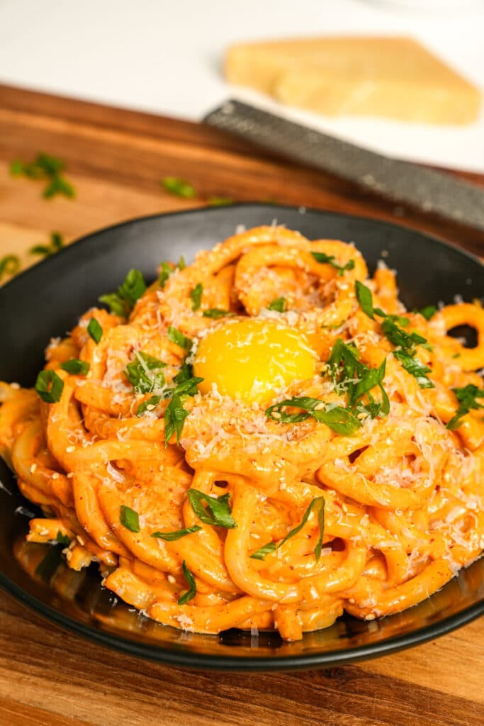 Creamy, spicy-sweet udon noodles tossed in a rich gochujang sauce with garlic and cream for a bold, comforting Korean-inspired noodle dish.