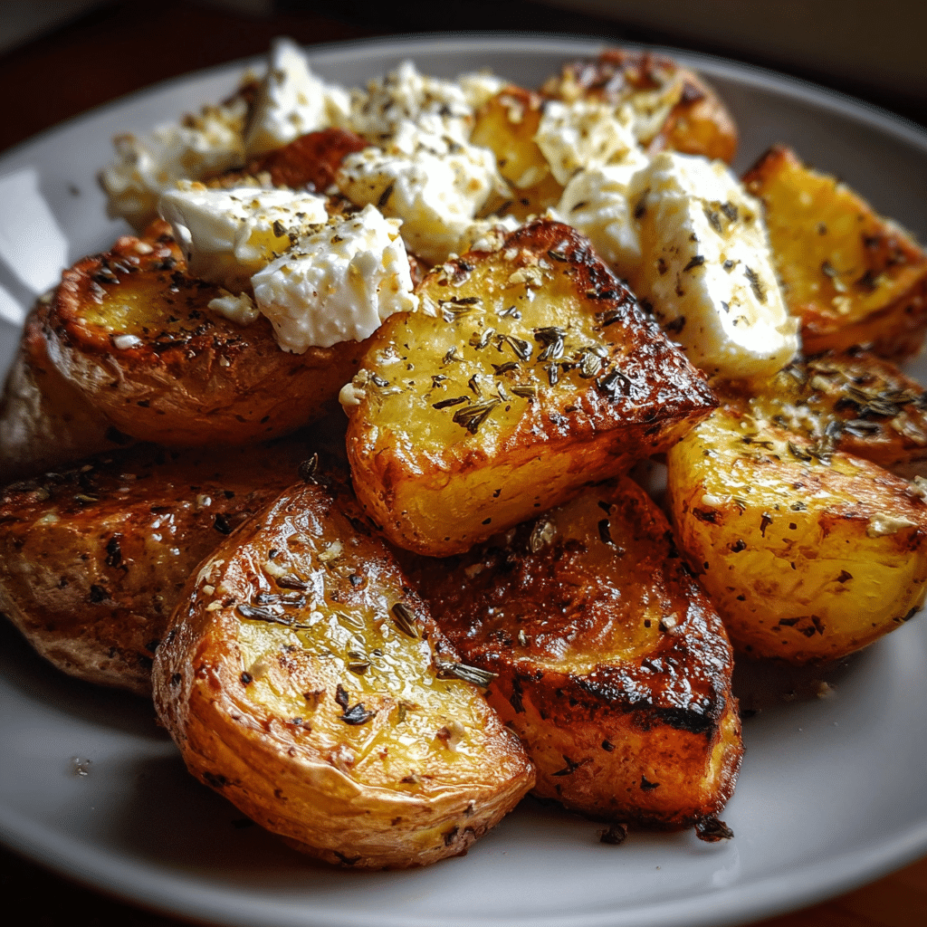 Crispy Greek-style roast potatoes tossed with olive oil, lemon, garlic, oregano, and finished with salty feta cheese for a flavorful Mediterranean side dish.