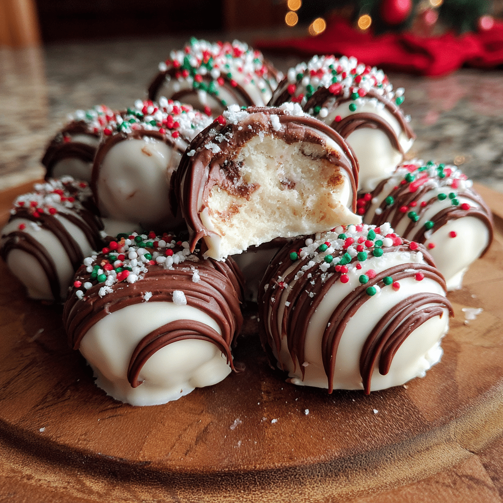 Remove the chilled truffles from the refrigerator and dip each one into the melted chocolate using a fork or dipping tool, allowing excess coating to drip off. Place the coated truffles back onto the parchment paper and immediately top with festive sprinkles before the chocolate sets. Allow them to rest until fully hardened.