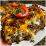 A hearty low-carb bacon cheeseburger casserole loaded with seasoned ground beef, crispy bacon, melted cheese, and a creamy egg-based sauce—perfect for a keto-friendly comfort meal.