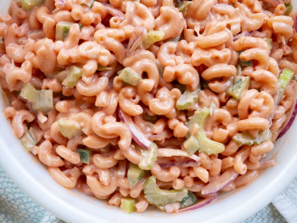 A colorful, creamy retro-style pasta salad made with tender pasta, sweet-and-tangy dressing, crisp vegetables, and a hint of sweetness—perfect for potlucks and parties.