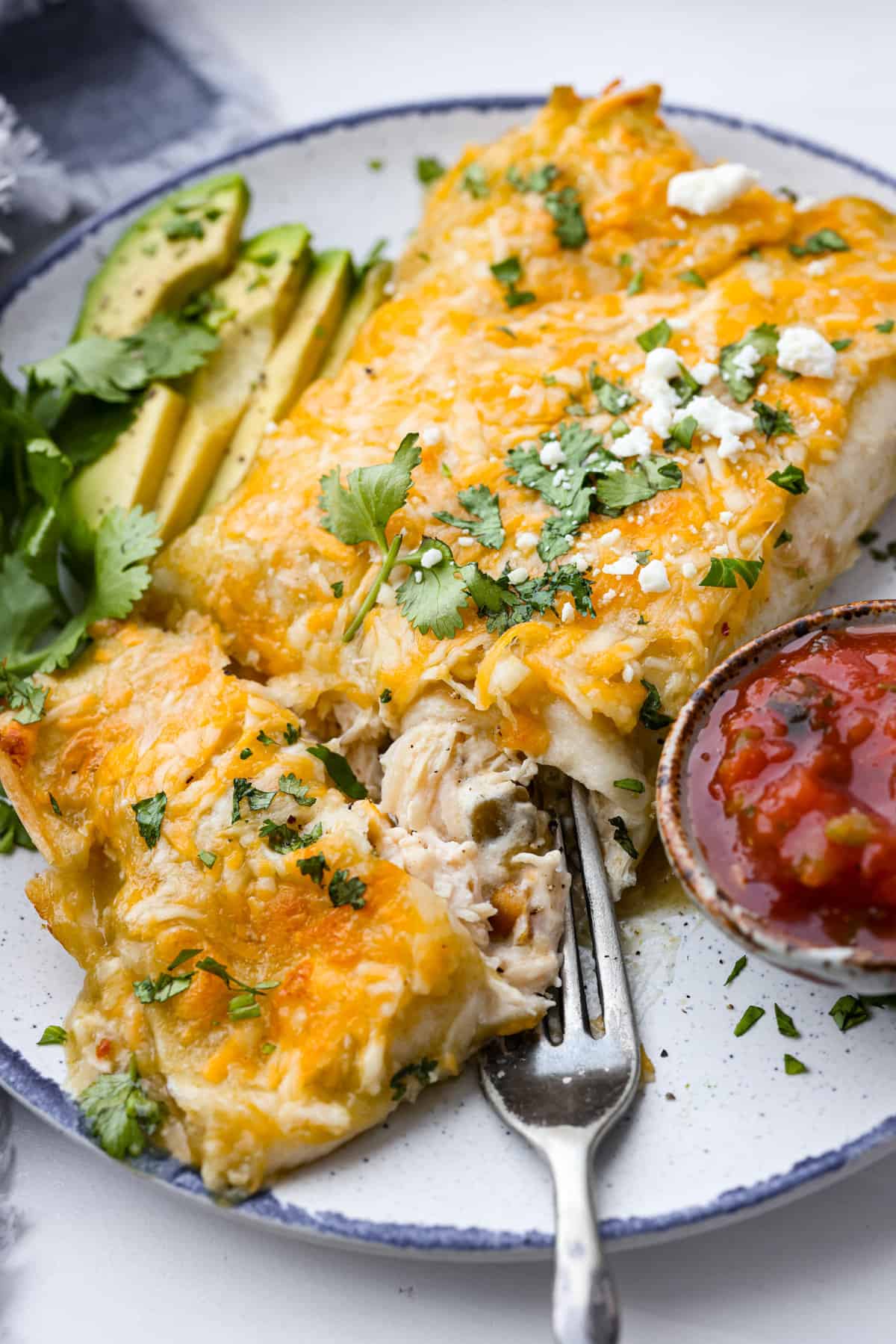 Bake uncovered for 30 to 35 minutes, or until the cheese is fully melted and bubbling. Allow the bake to rest for a few minutes before serving to help the enchiladas set.