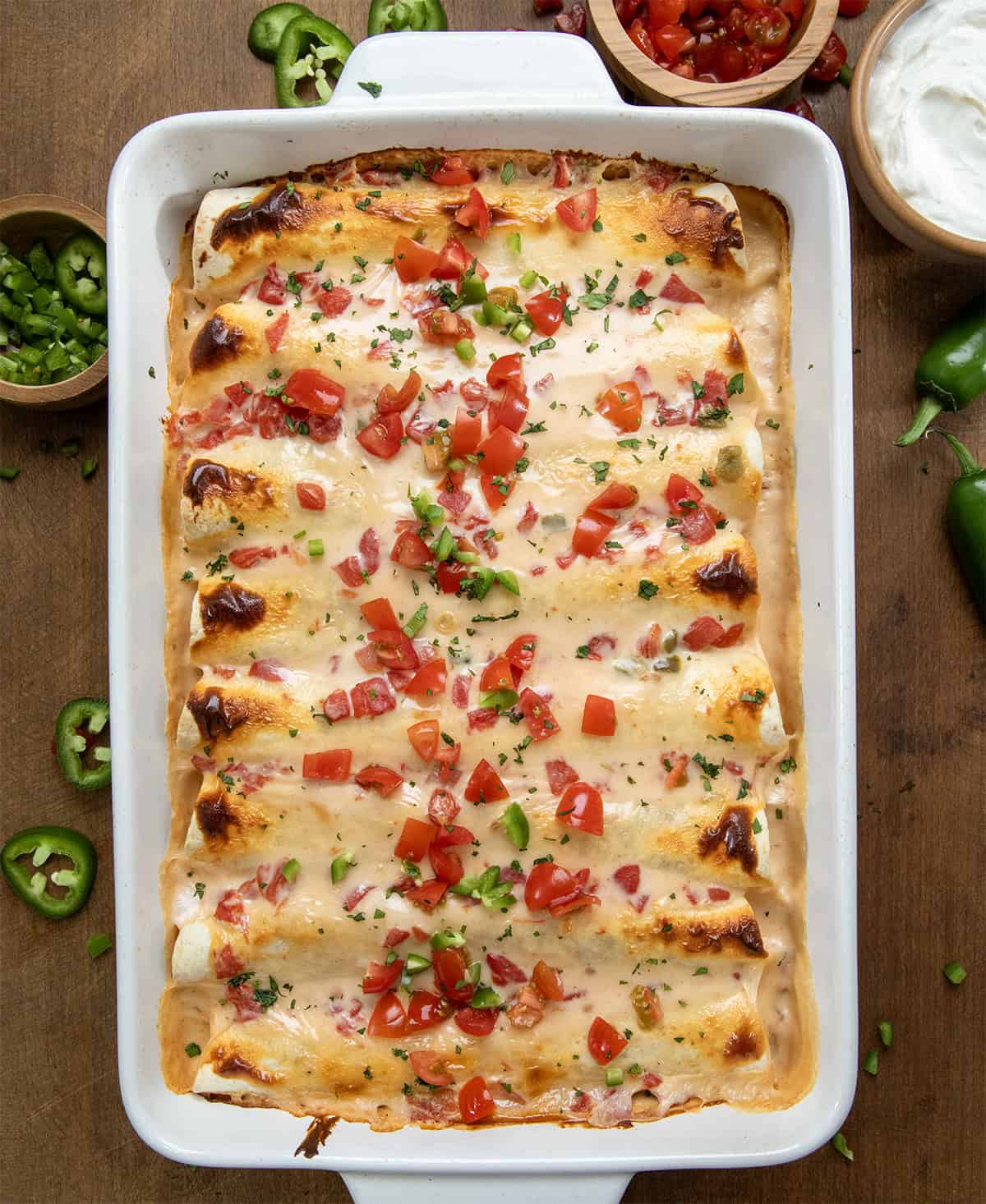 Store leftover enchiladas in an airtight container in the refrigerator for up to three days. Reheat in the oven or microwave until warmed through. Add a small splash of broth or extra queso if needed to maintain creaminess.