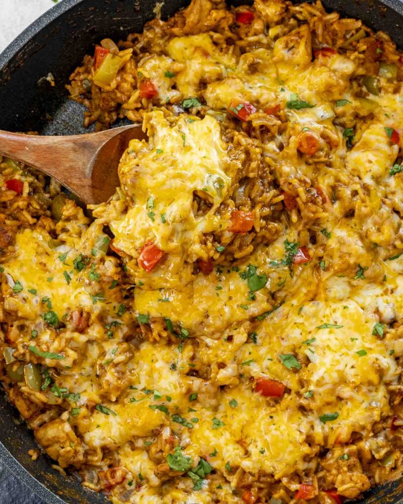 Queso Chicken Fajita Rice Skillet is very flexible. For added heat, stir in diced jalapeños or a pinch of cayenne pepper. A smoky version can be achieved by adding smoked paprika or using fire-roasted peppers.