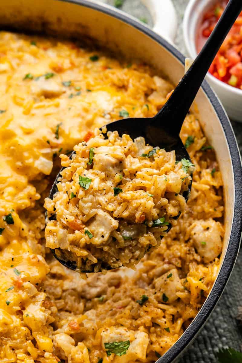 Rice forms the base of the skillet and soaks up all the savory flavors from the chicken and spices as it cooks.