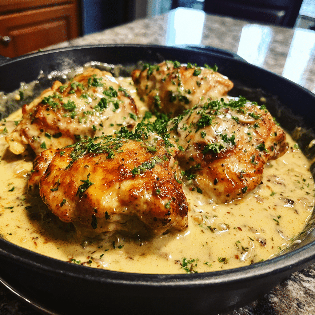 Begin by seasoning the chicken generously with salt and pepper. Heat butter and olive oil in a large skillet over medium-high heat, then sear the chicken on both sides until golden brown. Remove the chicken and set aside. In the same pan, reduce the heat slightly and sauté the minced garlic until fragrant, ensuring it does not burn. Pour in the chicken broth to deglaze the pan, scraping up any browned bits that add flavour. Add the heavy cream and Parmesan, stirring until the sauce thickens slightly. Return the chicken to the skillet, nestling it into the creamy sauce, and sprinkle with herbs. Simmer gently until the chicken is cooked through and the sauce has reduced to a smooth, luxurious texture. Taste and adjust seasoning if needed. Serve hot with your favourite side, spooning extra sauce over the top for a perfect finish.